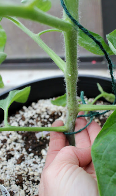 Tie one end of the string into a loose loop around the base of the tomato plant.