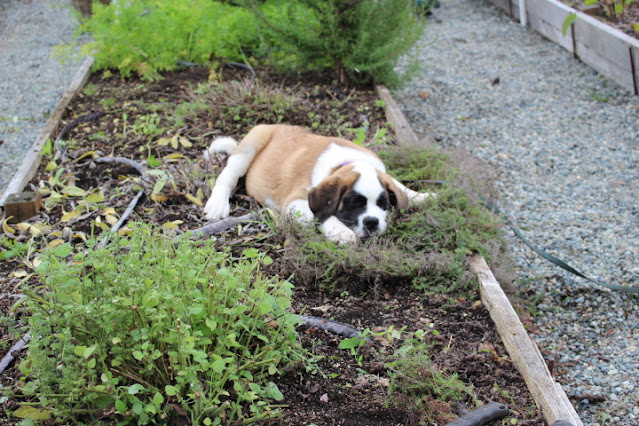 I thought it would take a while, but nope, within two days, we had a new puppy under contract and here at the potager. When it is meant to be, it is meant to be, just falls into place. Hemingway really likes her, they get along like a house on fire. So, now we are busy with fall clean up and puppy training, too ; )